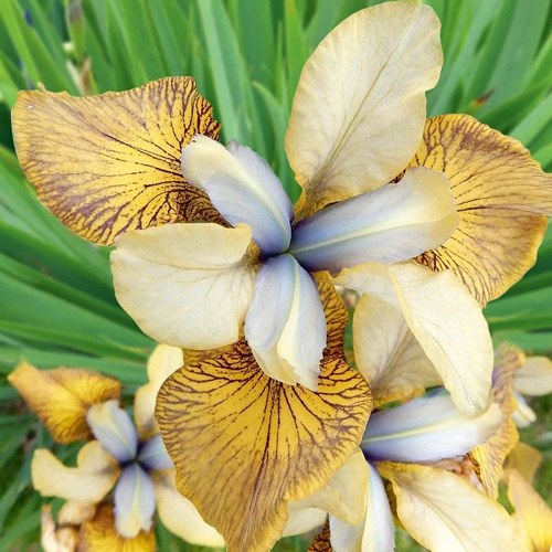 Цветение стартует в мае–июне и продолжается 2–3 недели. Цветки крупные, до 12 см в диаметре, двухцветные. Верхние лепестки — сиренево-светлые, далее — снежно-белые и нижний слой — лепестки с выразительными синими прожилками и солнечно-жёлтым пятном в основании. Такая палитра выглядит свежо и нестандартно, особенно в сочетании с другими многолетниками. Цветонос прочный, не склонен к полеганию, устойчив к осадкам и ветру. Цветов на одном побеге — 2–3, что делает композицию воздушной и живой. Аромат отсутствует, зато визуальный эффект — максимальный.